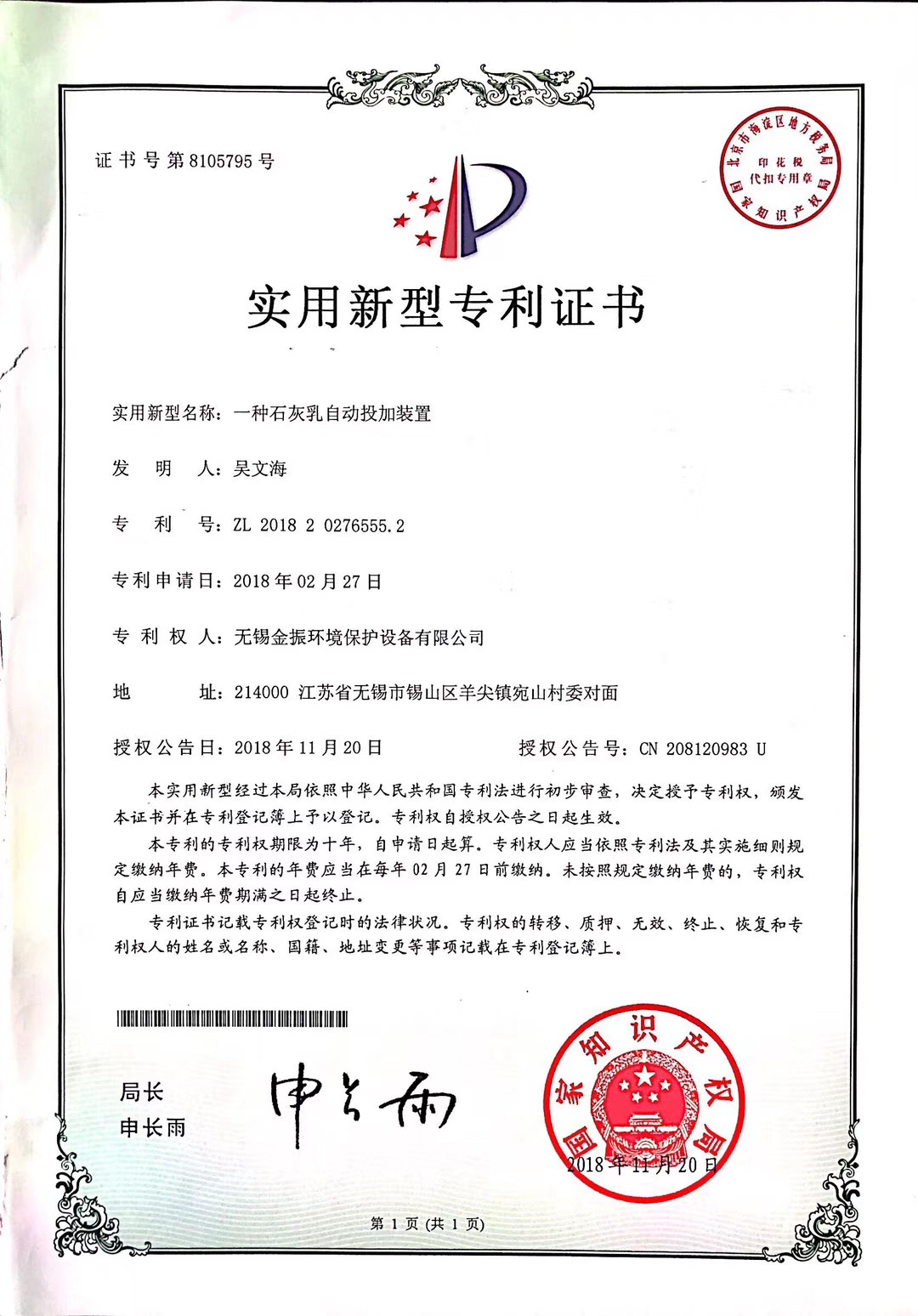 無錫金振環境保(bǎo)護設備有(yǒu)限公司又喜獲(huò)一種石灰乳自(zì)動投加裝置一項(xiàng)目實用新型專利證書,專(zhuān)利號(hào)為:ZL 2018 2 0276555.2  ,發明人:吳文海,授權公告日:2018年(nián)1120日。截止(zhǐ)目前,無錫金振環境(jìng)保護設(shè)備有限公司已榮獲多項專利證書。